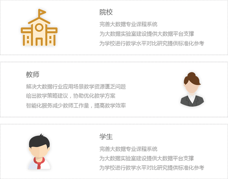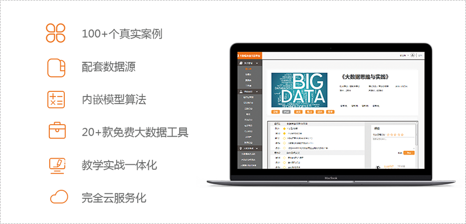 随着大数据时代的到来,各大高校、高职院校都开设了大数据专业或课程。然而,我国大数据人才的培养还处于摸索阶段,除了师资力量、教学体系有待提升以外,普遍还存在缺乏可供教学用的 数据源、实案例和实操环境。 作为拥有100+大数据成功案例的企业,在数据源、真实案例和平台建设能力中所具备的优势,正好能与高校大数据教学需求结合。 集课程管理、练习讲解、仿真实训、资源工具于一体的智能教学平台 为高校大数据教学提供线上实训环境及教学资料。让学生通过线上自主学习及实战演练,通过真实的行业应用场景案例,帮助理解大数据科学的原理,掌握数据科学的知识体系,真实体验大数据建模分析的实际操作与演练过程。 6大特点 全方位提升大数据教学水平 大数据平台:拥有近百万案例的大数据商业仿真应用案例库