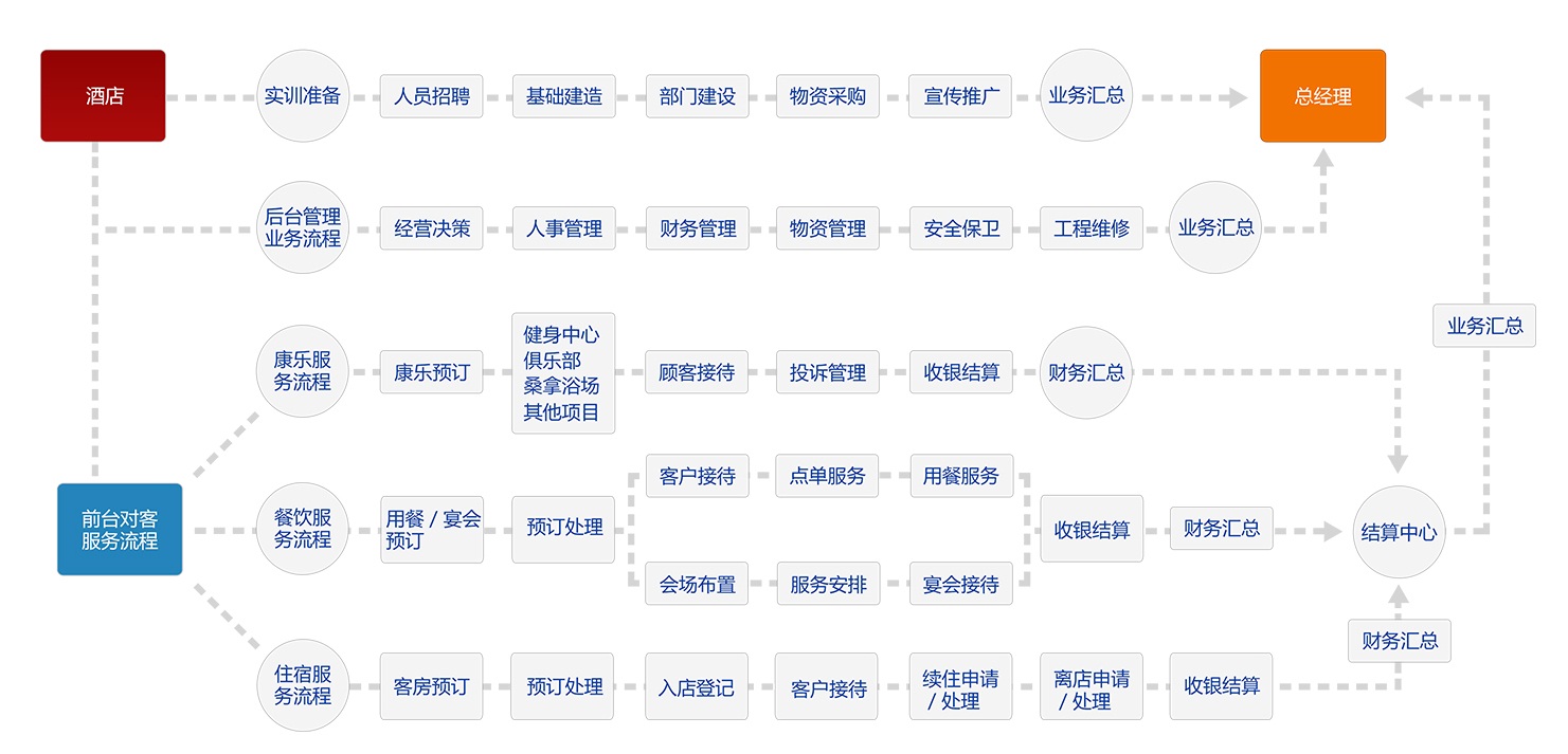 酒店经营管理实训教学软件根据三星级以上级别的酒店管理模式而设计,软件对酒店内各办公室、收银点、客房管理、大堂总台、中西餐厅、夜总会、KTV包房、商务中心、保管室等实行网络化管理,以为酒店业务管理为基础,实现全大厦各部门、各银点、客房部、商务中心等业务的网络信息交换和共享。